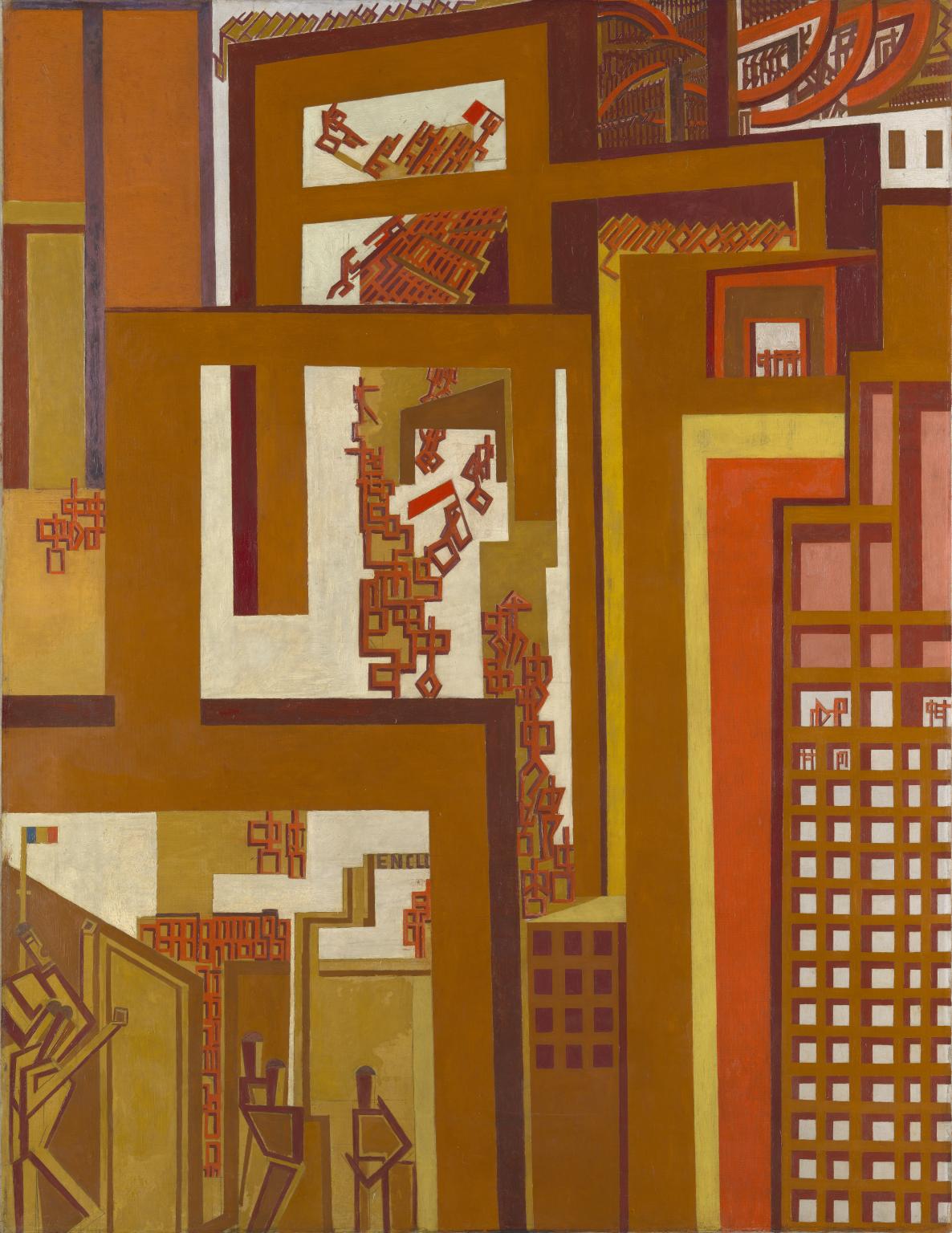 The Crowd (1915) is a visual portrayal of conformity and chaos, of individuals shattered by the city, which had been explored in Edgar Poe’s “The Man in the Crowd” (1840) and Gustave le Bon’s The Crowd (1895). It would later form the subject of David Riesman’s The Lonely Crowd (1950) and Elias Canetti’s Crowds and Power (1960). King writes that in “the abstract painting created by the [red and brown] bricks and bands, the viewer sees human beings reduced to mechanized robots imprisoned within grids.”